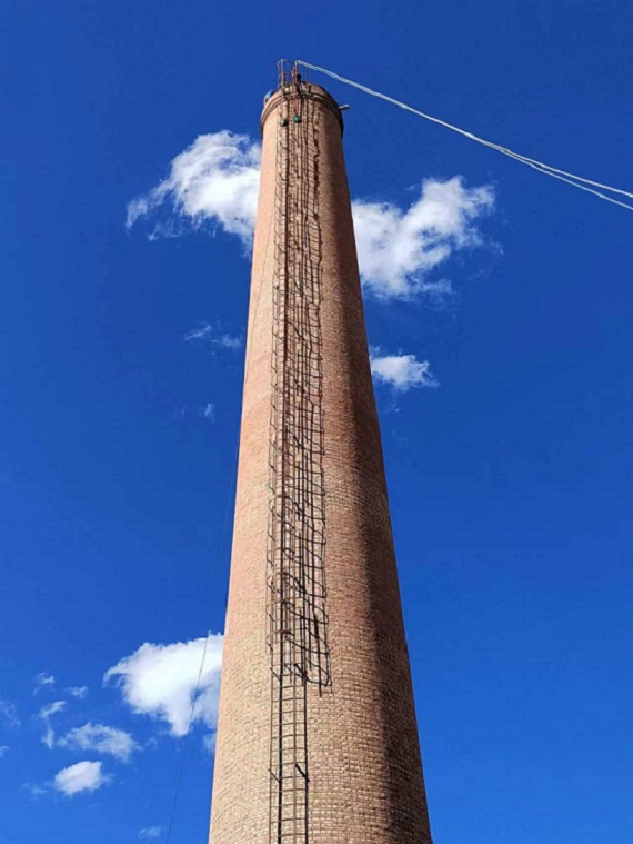 第一点,估算烟囱参数,烟囱拆除如果有准确的数据可以忽略,没有准确数据的朋友需要估算烟囱高度、烟囱下口径。烟囱高度采用爬梯数量及爬梯间隔高度获取,例如每个爬梯50cm,共80个,可以粗略估算烟囱高度43米左右。口径可以直接测量。
