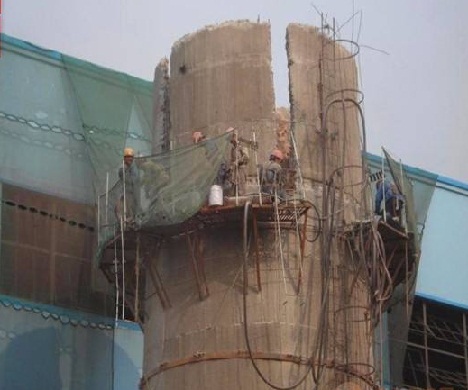 (3)烟囱人工拆除施工人员立在脚手架上,安全带挂在钢管上后,用风镐、手锤由外向内将筒体逐块拆除,使碴块全由筒体内部落下;