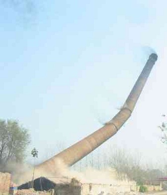 从平面图上看烟囱位于厂区东侧,烟囱倒塌中心线东侧离欲保护的输油管道仅18 m,西侧离4号、5号机主厂房和油泵房分别为20 m和14 m,南侧离欲保护的二层楼房(化水池)约35 m,北偏东侧是烟囱倒塌方向,环境相当复杂,见图l所示。根据现场踏勘测量及图中标设,烟囱仅有16°夹角的倾倒范围。总之,该betway必威中文版官网的特点为倾倒方向范围狭窄,烟囱内部结构不对称于倾倒方向线,烟囱简体施工质量较差,工程难度大,风险高。