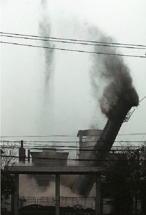 随着三声清脆的爆破声响,耸立在青岛开发区热电燃气总公司高达153米的红白相间的大烟囱按预定计划顺势向南倒去,一团烟雾腾空而起,数分钟后烟雾消散,临近建筑完好无损,中国乃至亚洲最高的建筑爆破宣告成功。