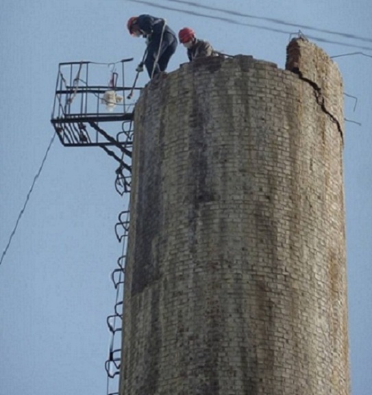 3、烟囱拆除前,应仔细检查爬梯腐蚀程度,不安全的地方进行加固,以便施工上下。